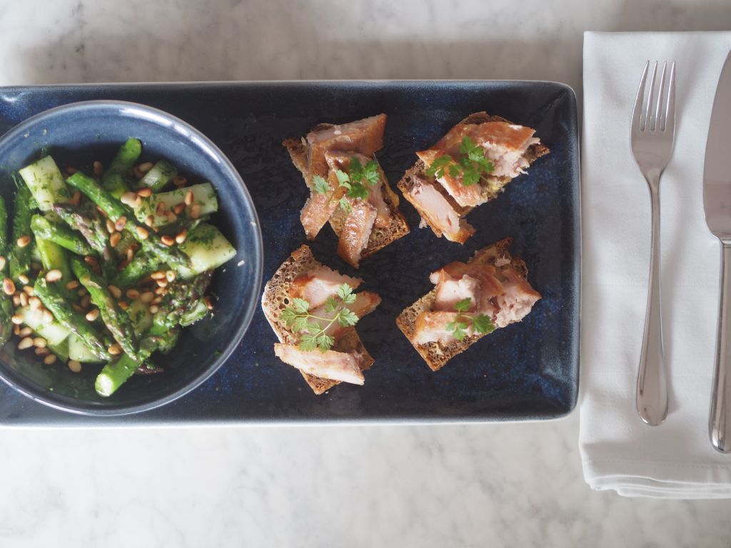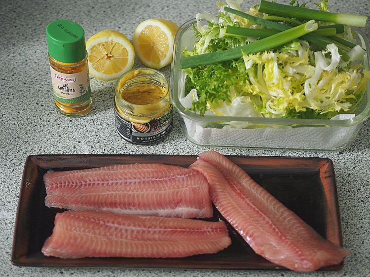 Welsfilet mit Spargelgemüse, Senfsoße und Krauser Endivie