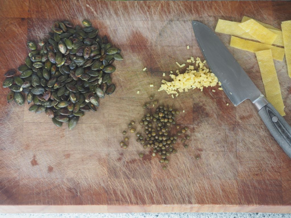 Mit Spargel aus Italien. Und mit Friséesalat auch Krause Endivie genannt, eine Rarität, die oft beim Herrichten von Schanktischen* zum Garnieren verwendet wird. Das Welsfilet war saftig und durch, obendrauf auf die Senfsoße kam ein Pfeffer-Topping mit der Drei-Pfeffer-Mischung, deren Schärfe abgemildert war durch Beigabe von gehacktenKürbiskernen.