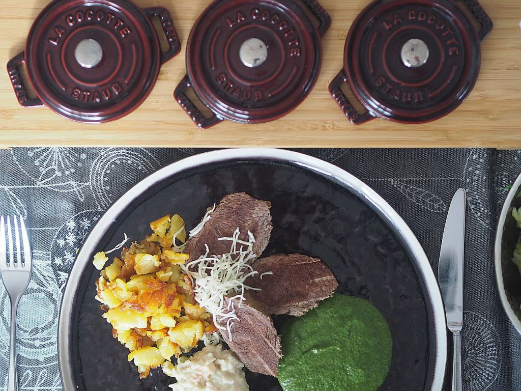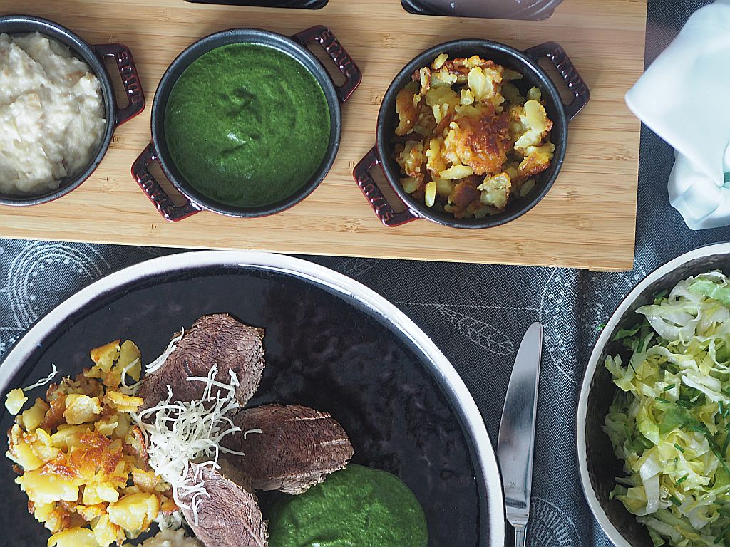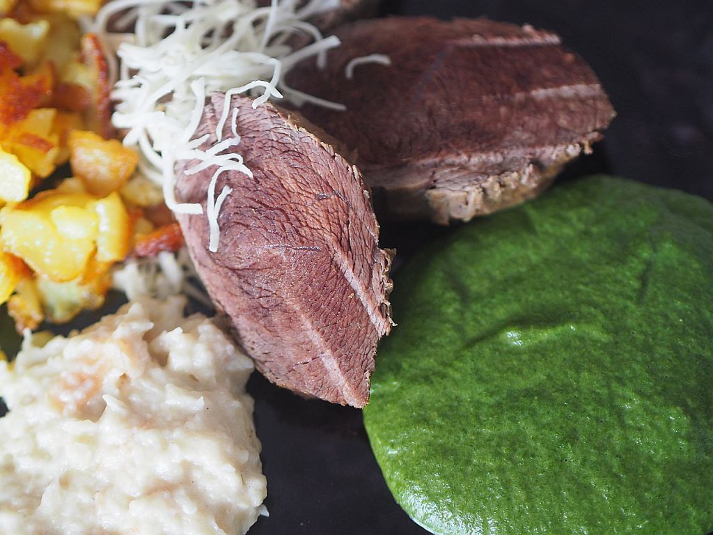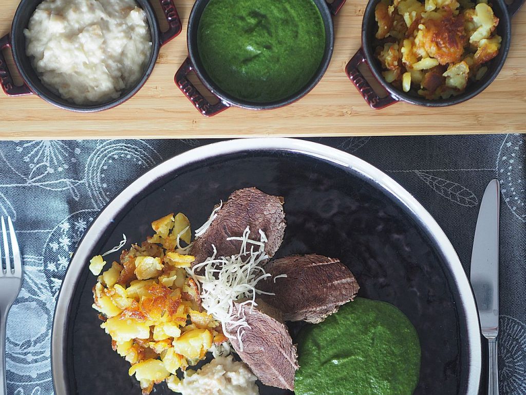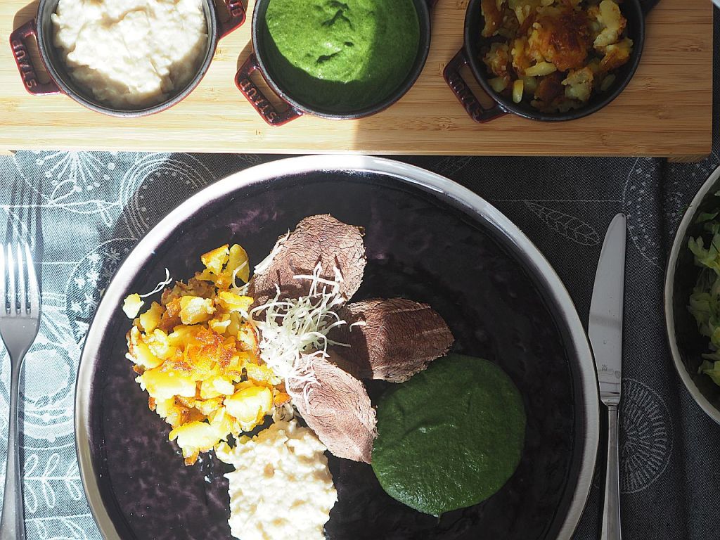 - Durchführung: Mageres Meisl mit Spinat, geröstete Erdäpfeln, Semmelkren und Zuckerhutsalat