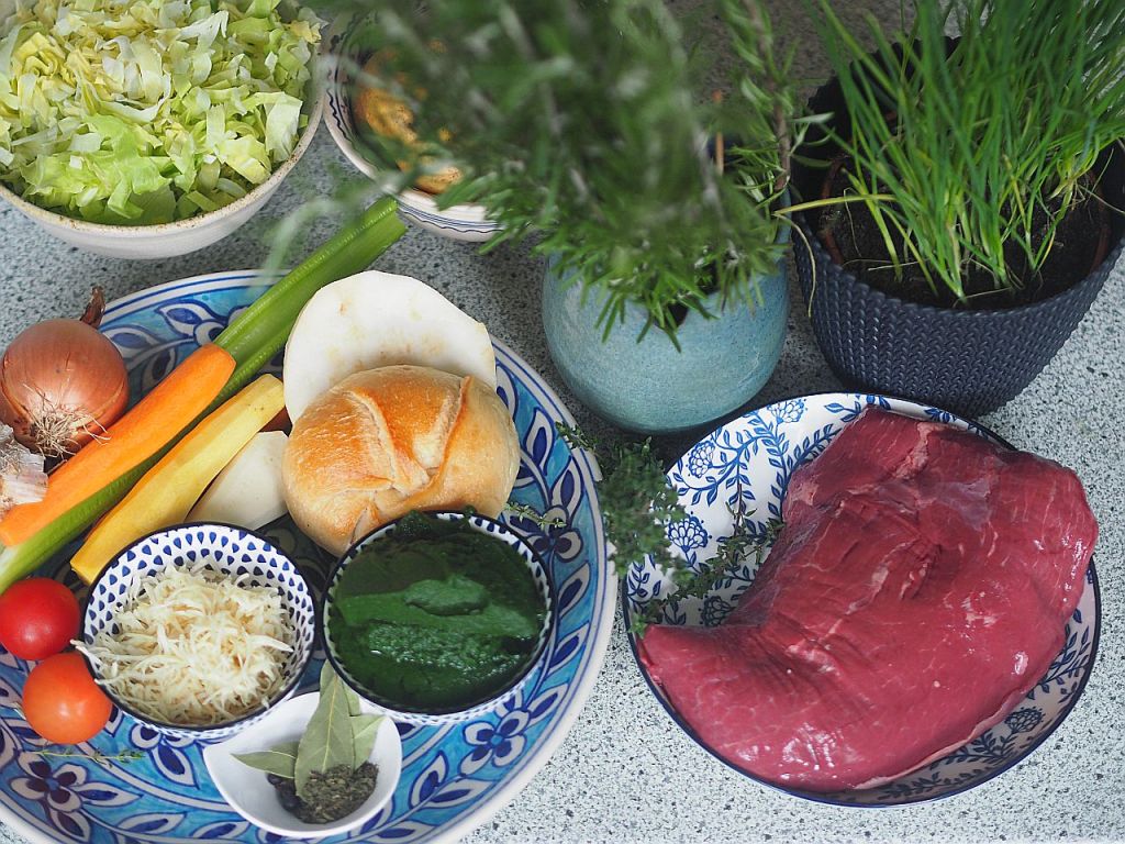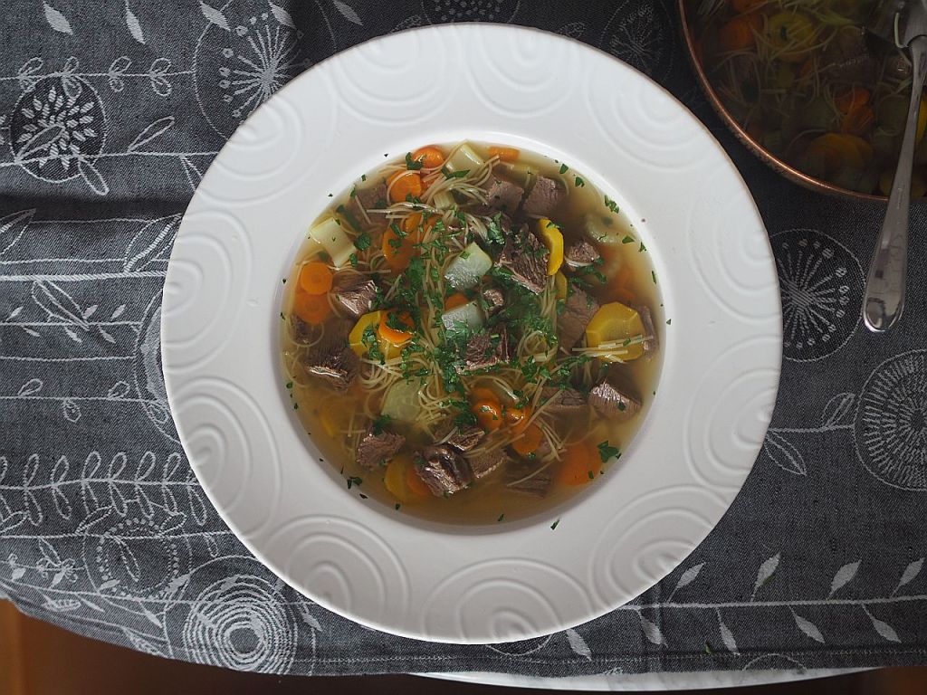 - Noch einmal das Hauptthema, das magere Meisl, in der Suppe. Neue Seitenthemen werden eingeführt: gelbe und rote Karotten, Stangensellerie, Kohlrabi, Petersilwurzel und Nudeln. Damit kommen wir unserem Ziel, 30 verschiedene Gemüsesorten pro Woche zu essen, einen gewaltigen Schritt näher.