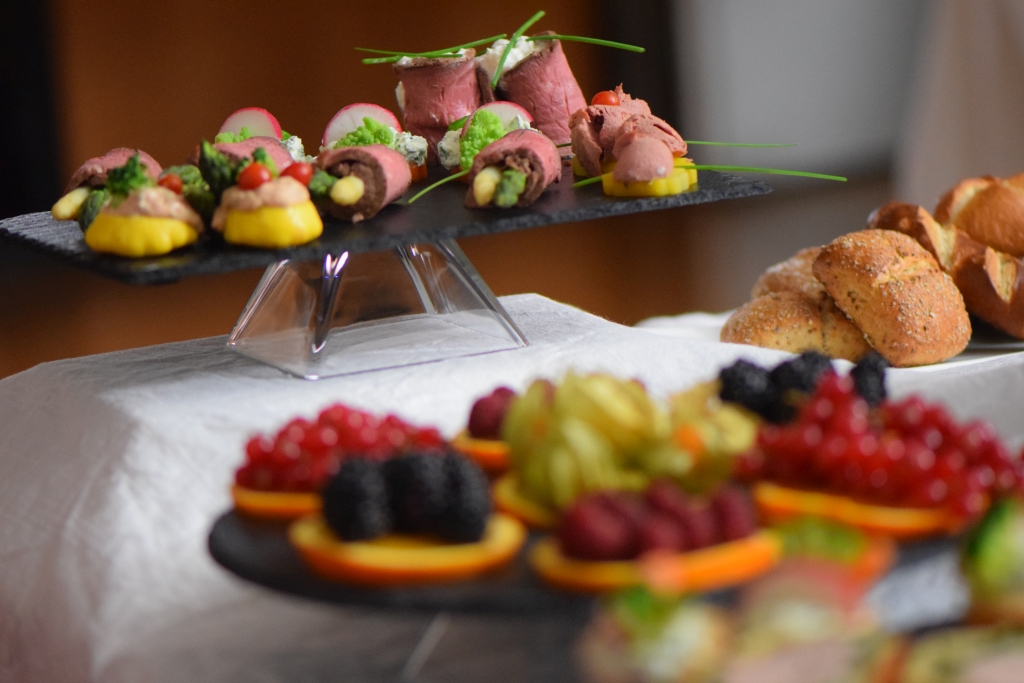 Platten mit Roastbeef-Röllchen, Schweinslungenbraten in Spinat und Topfenteig mit unter anderen Karotten-, Fenchel-Garnituren sowie einer Obst-Platte.