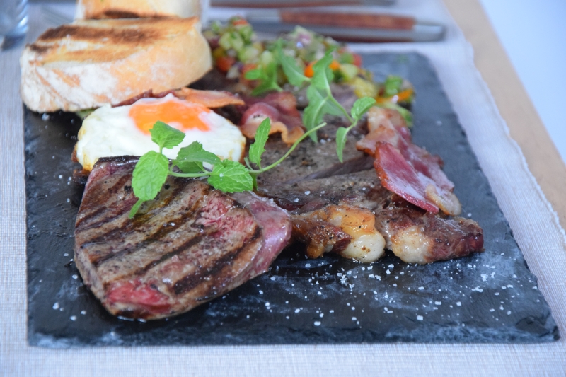 Wobei die Ofen-Pommes Frites aus Süßkartoffel waren und der Salat neben Tomaten, Rotkohl, Gurken und anderem auch das seltene Gurkenkraut Boretsch beinhaltete. Das Steak wurde gegrillt. Dazu Kerbel-Aioli.