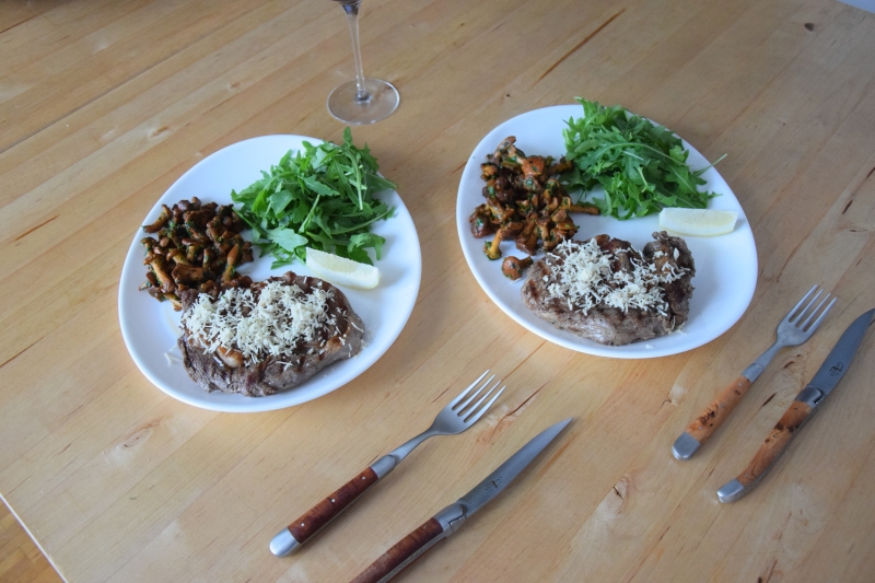 Steak mit Eierschwammerl und Rucola