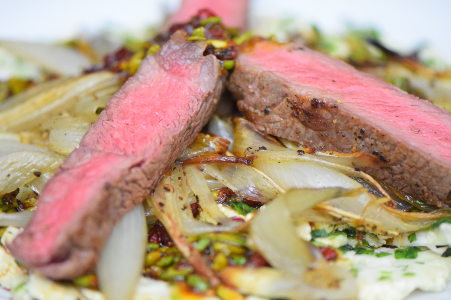 Langsam geräuchertes U.S. Beef, dazu roher (!) dünn aufgeschnittener Blumenkohl, gebratene Schalotten, Salsa aus Berberitze, Pistazien, Honig und Harissa und iranischem Limettenpulver.