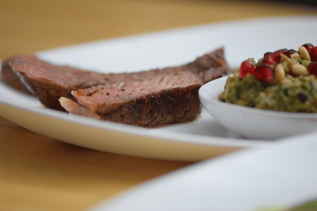 Rauchiger Auberginendip mit Knoblauch und Granatapfelkernen, Jalapenosauce zum kalt geräucherten U.S. Beef. Die Jalapenosauce ist so gut, man sollte immer frische Jalapenos zu Hause haben. Als Vorspeise: Rosenkohlsalat mit Wachteleiern und Austernpilzen