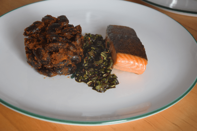 2 rote Paprika, 2 gelbe Paprika, 2 grüne Paprika, 3 mittelgroße rote Zwiebeln, 400 g Käferbohnen, 100 g gelbe und grüne Fisolen, und das restliche Rindfleisch zirka 300 g, eine Handvoll gehackte Kürbiskerne, reichlich Kürbiskernöl, Apfelessig, Salz.