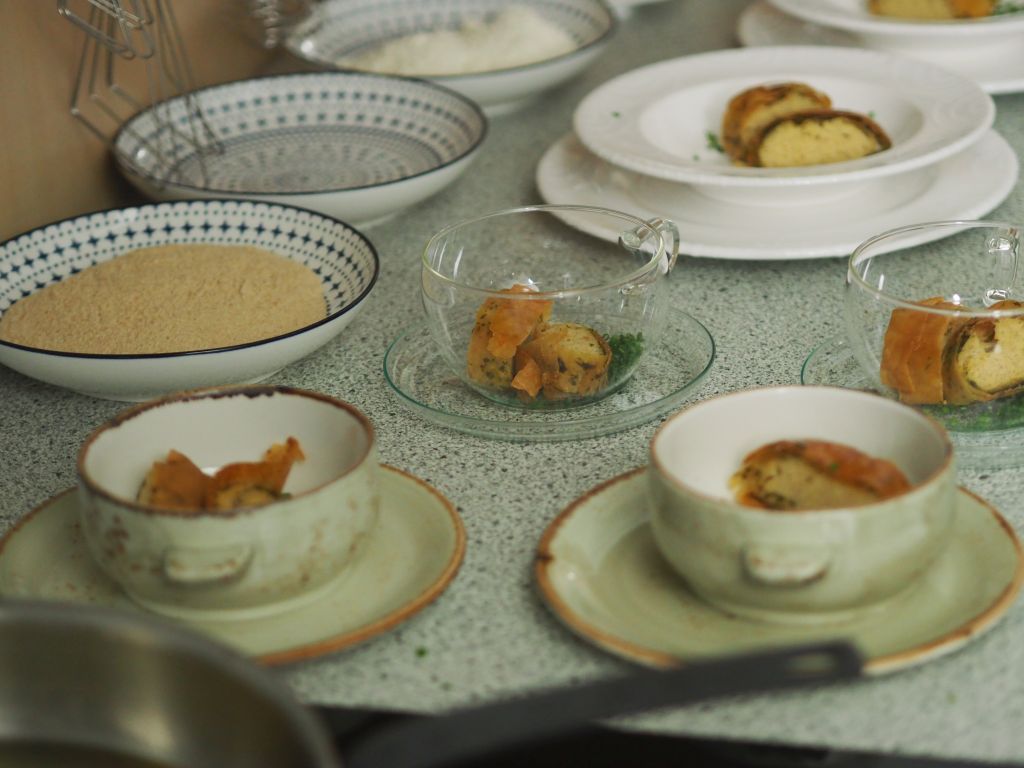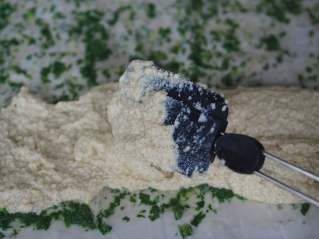 Manche bestreichen den Grießstrudel nicht mit Butter, hier wird er sogar mit einer Petersilienbutter bestrichen. So bekommt er einen glänzend grünlichen Schimmer obendrauf.