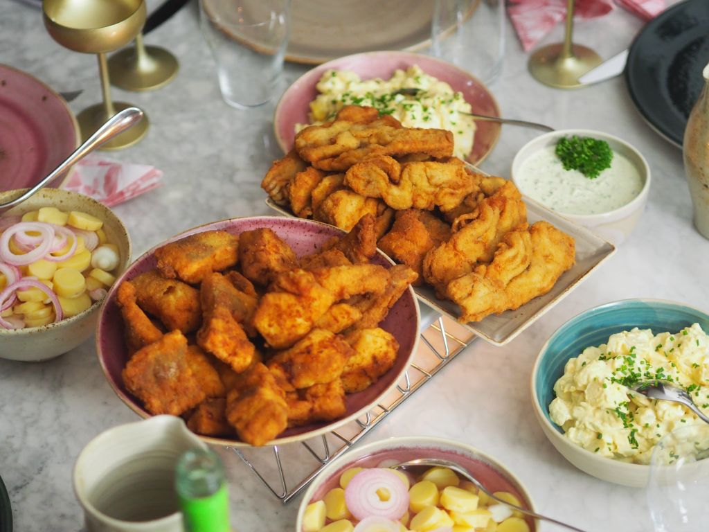 Gebackener Karpfen mit Erdäpfelmayonnaise-Eiersalat und Erdäpfelsalat mit einer süßsauren Marinade