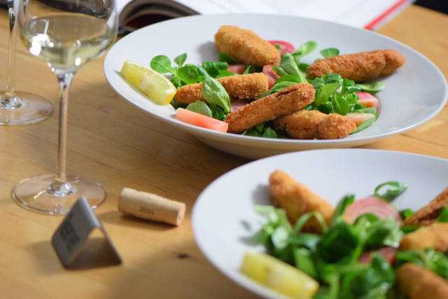 Eine Topinambursuppe mit Pinienkernen und Koriander als Vorspeise. Danach ein gebratenes Kalbkotelett, das mit einem Salat aus gebratenem Chicorée, Kapernbeeren und Knoblauch in einer Orangen-Kapern-Butter serviert wird.