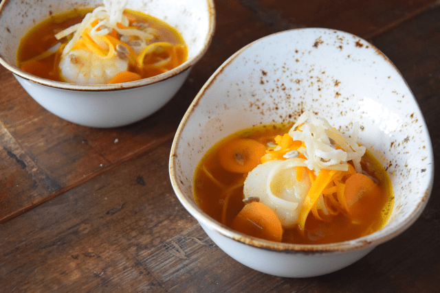 Eine Fischsuppe mit einer Würzpaste aus Zitronengras, Chili, Kaffirlimettenblätter und Knoblauch. Mit Kurkuma, Yuzu-Saft und Honig. Dazu gemahlene iranische Limone und süße Pfefferflocken aus Altino/Italien. Mit Meeresspaghetti und frittierten Schalottenringen, beide aus Frankreich. Und alles Paleo.