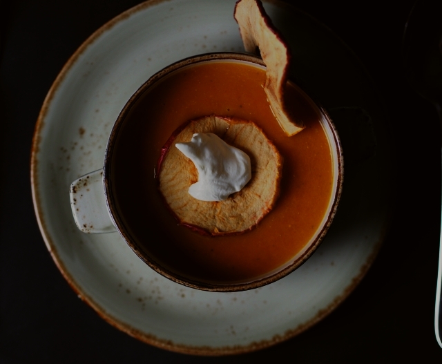 Eine Suppe im Pelz, wobei eine Blätterteigkruste als Pelz fungiert. Wenn eine Selleriesuppe getrüffelt da her kommt, darf sie auch Pelz tragen. Der Sellerie ist so sämig, dass man glaubt, da wäre geschmolzener Käse drin.