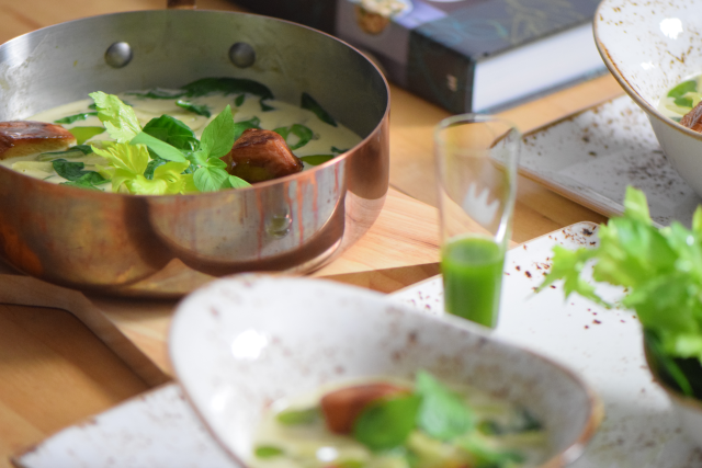 Poularde mit Limettencurry in einem Schälchen, Blätter vom Thaibasilikum und Stangensellerie in einem anderen Schälchen. Dazu ein Stamperl Thaibasilikumöl zum Nachschenken ins Limettencurry, alles serviert auf einem großen rechteckigen Teller als Tablett. Fast wie im Fastfood-Restaurant.