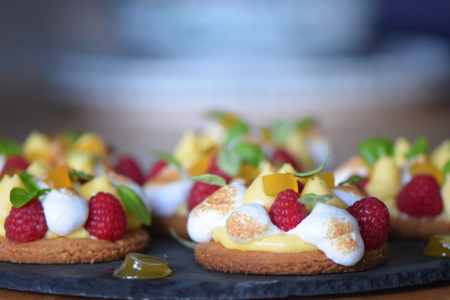Eine Tarte belegt mit Himbeeren, Zitronencreme mit Mango und Basilikum, einem Fruchtgelee mit Minze und Basilikum, der Boden ein Mürbteig mit Basilikum. Dazu gibt es einen Cocktail mit Orangen-Minze-Sirup aufgespritzt.
