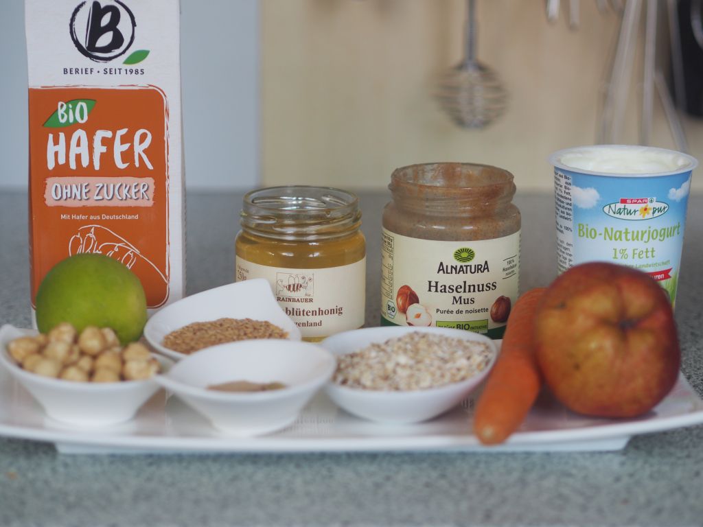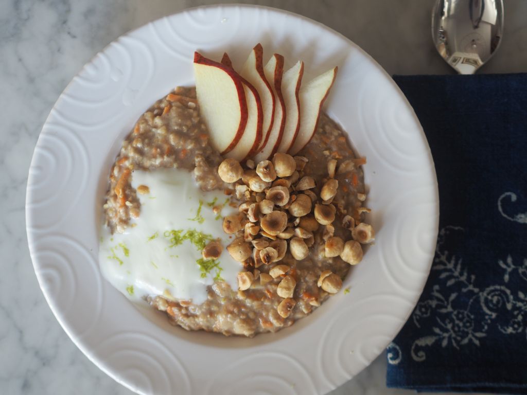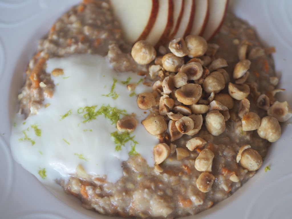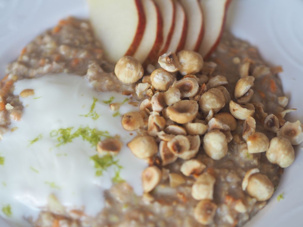 Halben Liter Hafermilch aufkochen, zurückdrehen, dann 100 g Haferflocken und 3 EL Leinsamen dazugeben. Kurz auf dem Herd noch köcheln lassen und vom Herd nehmen, 3 Prisen Kardamom und 1 Prise Salz einrühren und dann ziehen lassen. Eine Karotte raspeln, eine halbe Williams-Birne würfeln und die andere Hälfte in Streifen schneiden. A n r i c h t e n Wenn der Haferbrei ausgekühlt ist, so lauwarm ist, 1 TL Akazien-Honig aus dem Burgenland, 1 EL Haselnußcreme, – ohne Zuckerzusatz – 40 g geraspelte Karotten, die geraspelte Birne und ein paar Spritzer Limettensaft einrühren, in einen Teller geben und mit der in Spalten geschnittenen Birne, mit den gehackten gerösteten Haselnüssen aus dem Piemont, 1 EL Joghurt und geriebener Limettenschale belegen.