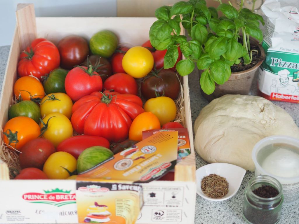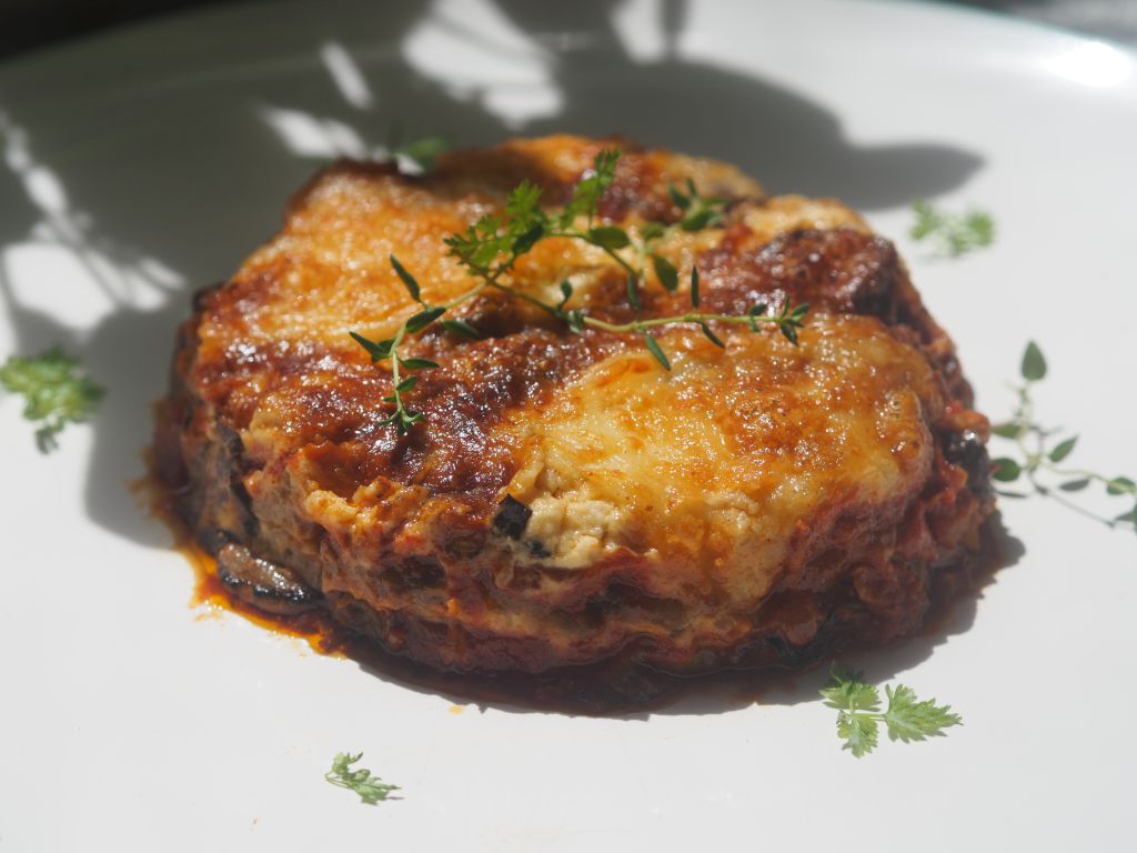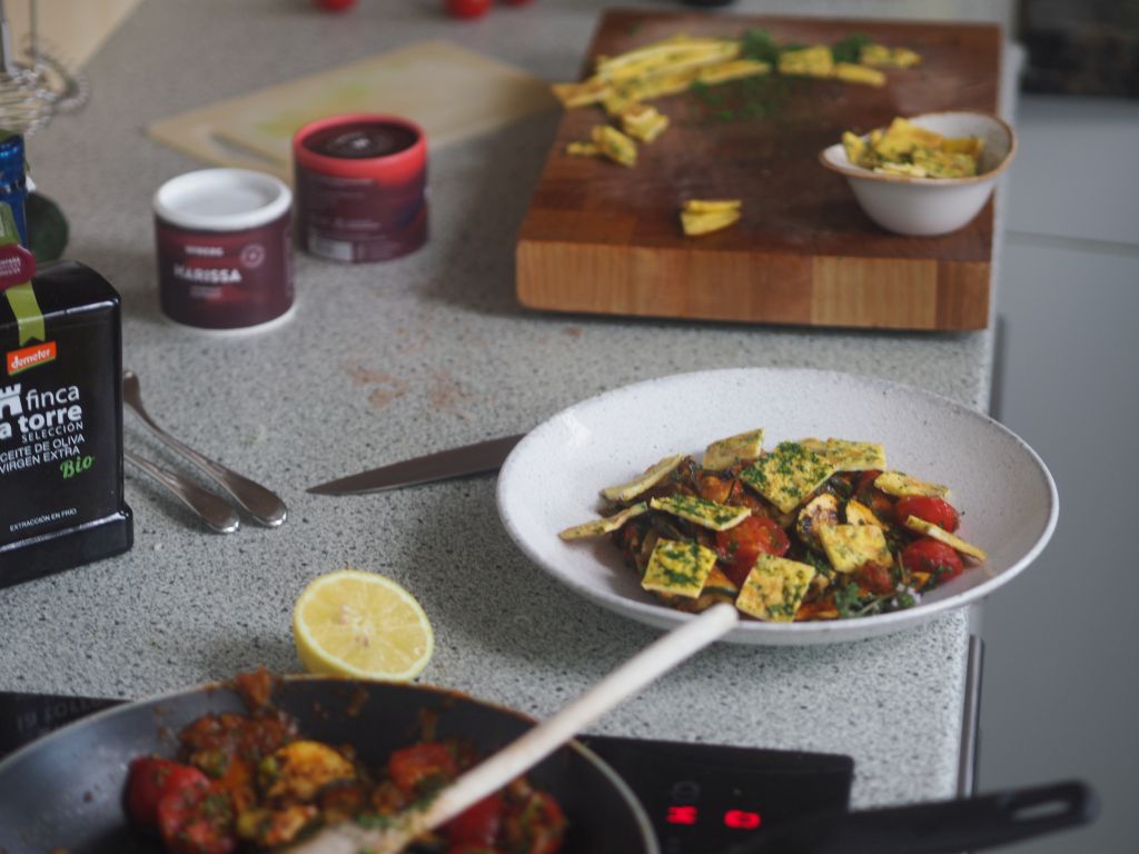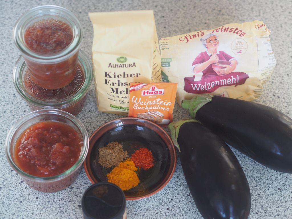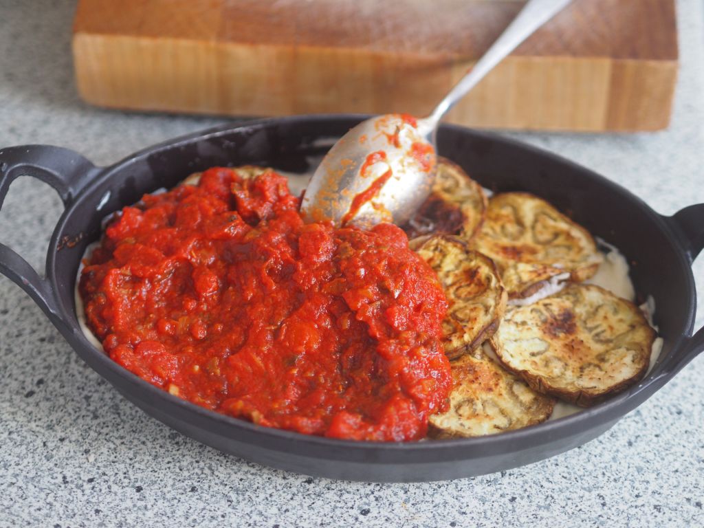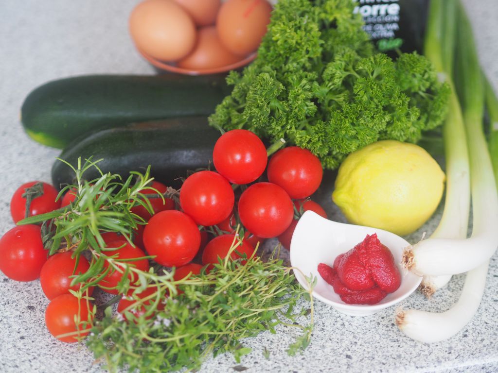 Die Tomatensauce kommt extra dazu und nicht rein in die Fülle, das ist so erfrischend. Harissa ergibt eine feine Schärfe. Ziegenkäse statt Mozzarella wegen überzüchteter Kuh, Stichwort A1-Milch.