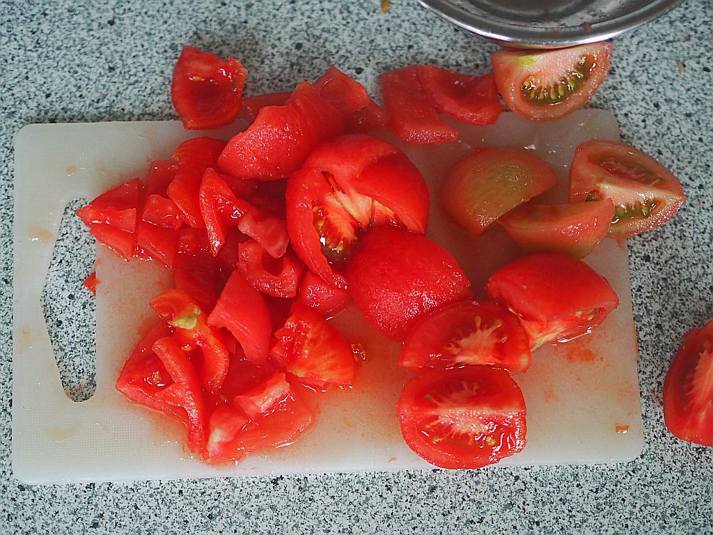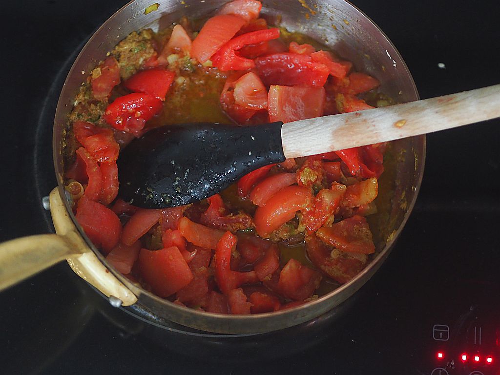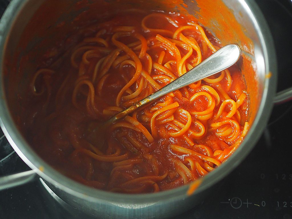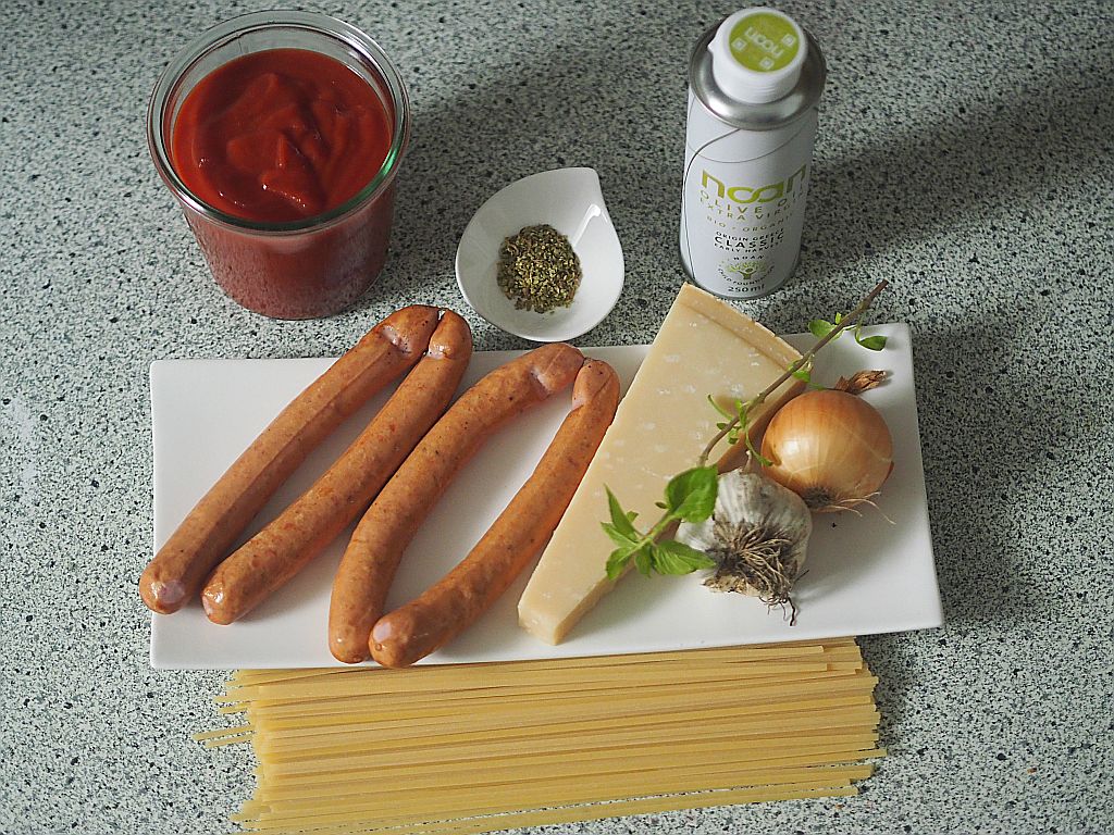 Für 2 Portionen: 1 mittelgroße Zwiebel, Olivenöl, 4 Knoblauchzehen, 1 EL Agavendicksaft, 1 EL Sherry-Essig, 400 ml pürierte Tomaten, Oregano und Basilikum, Salz, 2 Paar Wiener Würstel, Parmesan