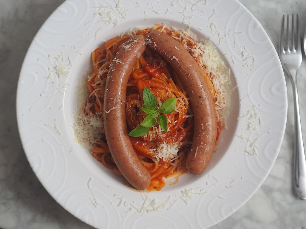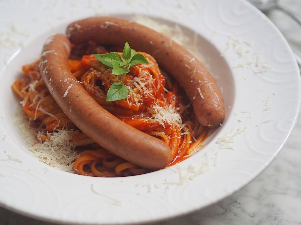Zwiebel klein hacken und in Olivenöl anschwitzen. Nachdem es hellbraune Farbe angenommen hat, die Knoblauchzehen dazureiben und anschwitzen. Agavendicksaft dazugeben und karamelisieren. Mit Sherry-Essig ablöschen, einköcheln lassen und dann die pürierten Tomaten dazugeben. Gehackten Oregano und Basilikum reingeben und leise etwa 20 Min. köcheln lassen, und zum Schluß mit Salz abschmecken. In der Zwischenzeit die Spaghetti kochen und die Würstel sieden (nicht kochen). Mit geriebenem Parmesan servieren.