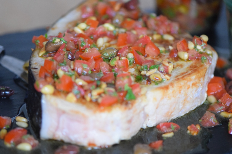 dazu geröstete Pinienkerne, Sesam-Ciabatta und Salat.