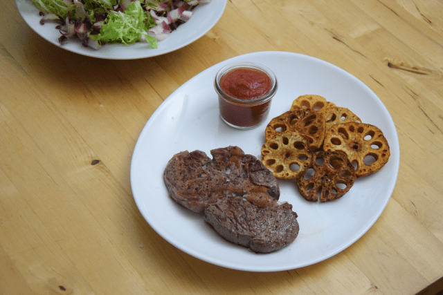 Lotuswurzeln eignen sich sehr gut dafür, sie zu frittieren. Dazu ein Steak und selbstgemachtes Ketchup, das uns für die Zubereitung der APP BBQ Sauce übrig geblieben ist.
