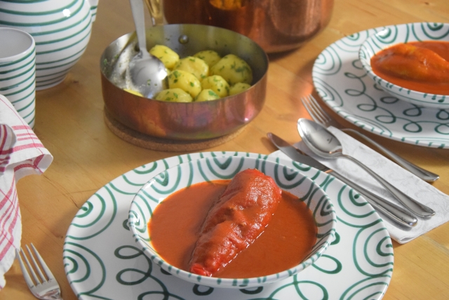 Paprikaschoten gefüllt mit schwarzem Reis und Faschiertem vom Jungrind in einer Tomatensauce, dazu Petersilkartoffel.