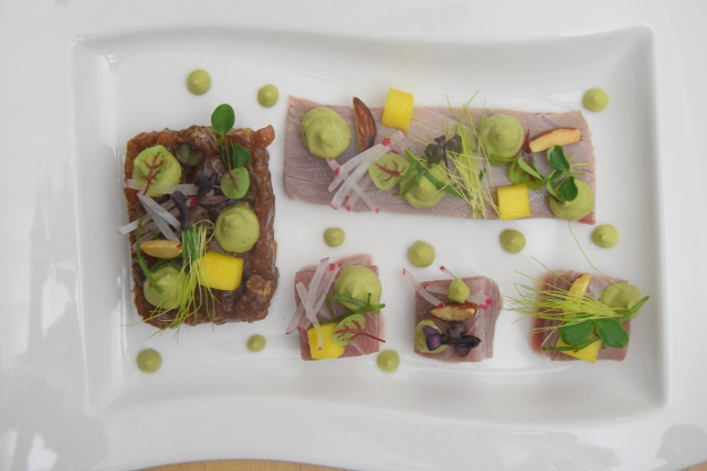 Thunfischtataki, Thunfischtatar, Thunfischcarpaccio mit Asiamarinade. Mit Avocadocreme, Radieschenstifteln, Rauchmandeln und Mangowürfeln. Dazu Curcuma Cracker.