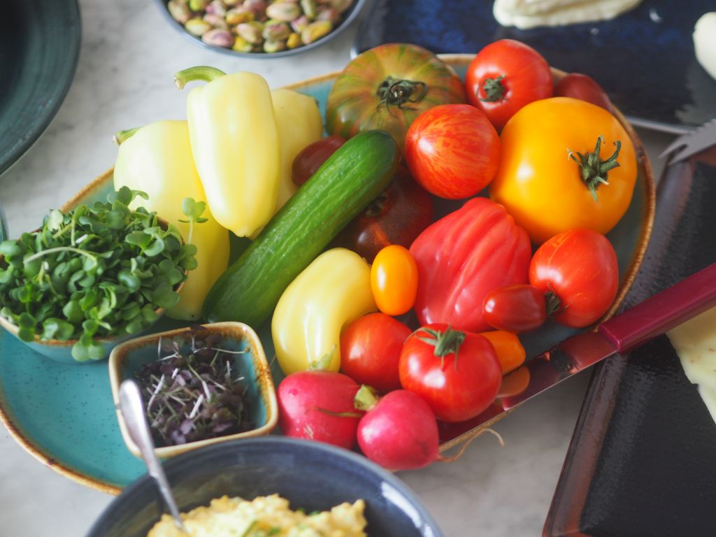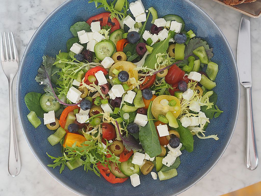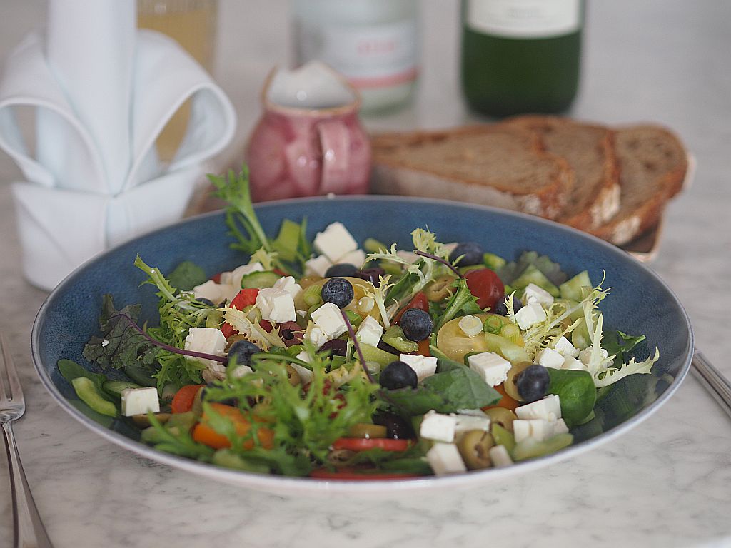 Wieder zu Hause hat die Hofköchin den „Alles was gut ist, kommt hinein“ -Salat gemacht. Mit Friséesalat von Keltenhof, sowie Baby-Spinat, Wasserkresse, Landkresse, Kale rot, Kale grün: und von blün: Salatgurken, Tomatenraritäten aus Simmering, italienische Jungzwiebel, griechische Oliven und griechischen und französischen Schafkäse.