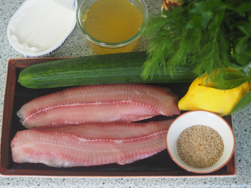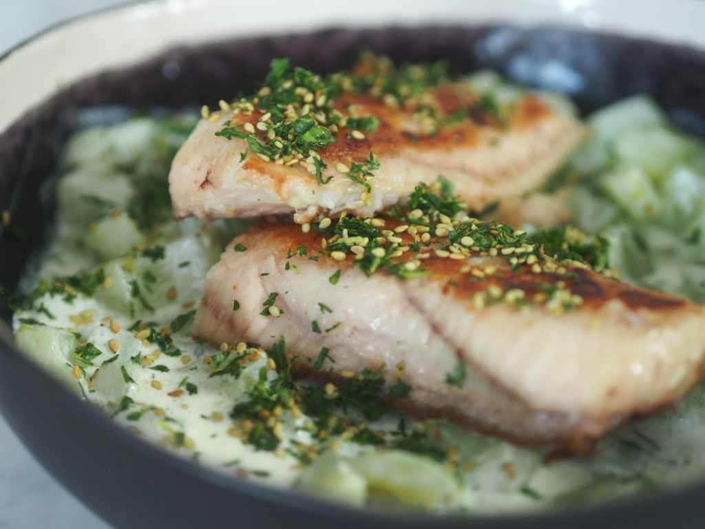 Welsfilet mit Spargelgemüse, Senfsoße und Krauser Endivie