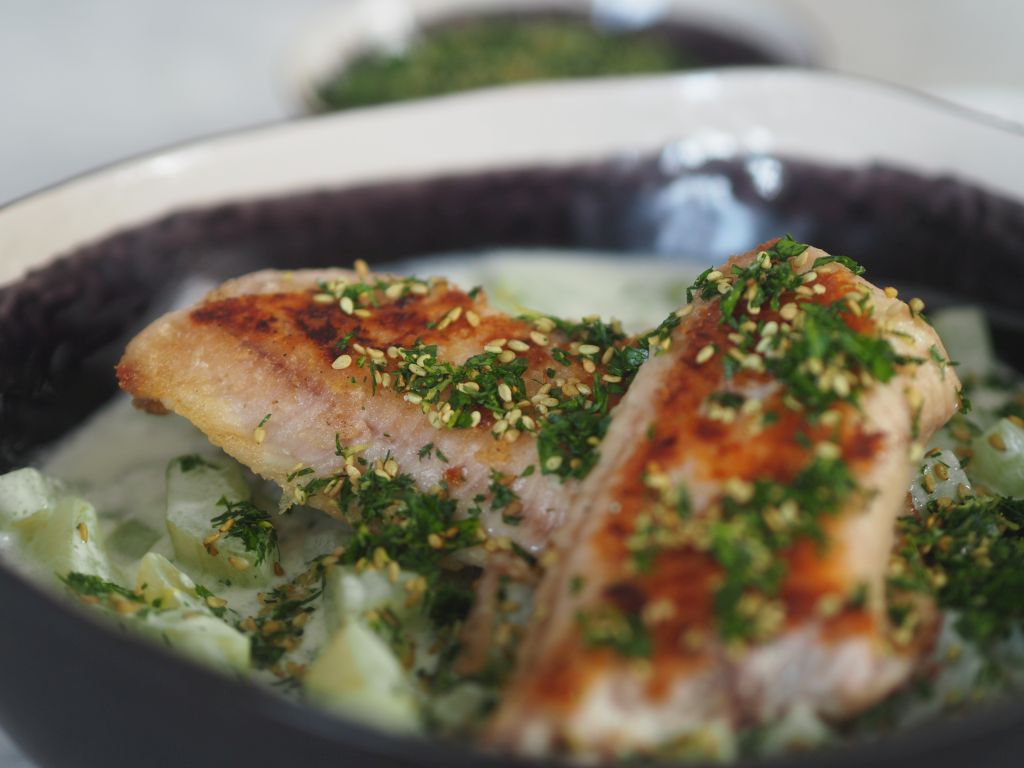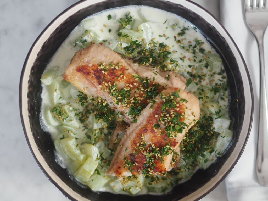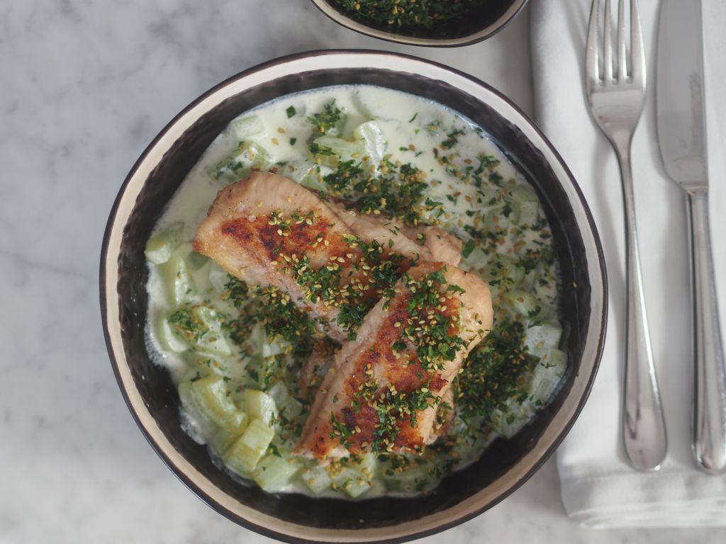 REZEPT Spargel 16 weiße Spargelstangen schälen, den holzigen Teil abschneiden und mit diesen Teilen den Spargelsud zubereiten. In den Dampfgarer geben und den Spargel bißfest garen, ein paar Min. Auf die Seite stellen. Egerlinge 400 g geviertelte braune Egerlinge in der Pfanne ohne Öl scharf anbraten. Wenn die schön braun sind, 2 EL Olivenöl dazu geben. Kurz in der Pfanne mitschwenken. Und dann in ein Sieb gießen, die abtropfende Flüssigkeit von Olivenöl und Bratensaft in einer Schale auffangen. Egerlinge warmstellen. Den bißfest gegarten Spargel in mundgerechte Stücke schneiden. In der heißen Pfanne ohne Öl hineingeben und die Olivenöl-Egerling-Bratensaft-Mischung auf den Spargel gießen. Ein bißchen salzen. In der Pfanne schwenken. Fisch Die Welsfilets knusprig in einer anderen Pfanne anbraten. Senfsoße 3 kleine fein gehackte Schalotten in 2 EL Olivenöl hell anschwitzen. 200 ml Spargelsud aufgießen. 4 TL körnigen Estragonsenf und 150 g Frischkäse hineinrühren auf mittlerer Hitze ein paar Min. köcheln. Dann Kurkuma dazugeben. Mit Salz und Zitrone abschmecken. Topping 3 EL gehackte Kürbiskerne in der Pfanne anrösten. In eine Schüssel geben. mit dem Abrieb einer Amalfizitrone, Meersalz und Lieblingspfeffermischung der Hofköchin mischen. Anrichten die Krause Endivie auf den Teller drapieren. Dann die Spargelstücke, die Egerlinge darauf platzieren, das Fischfilet darauf legen und die warme Senfsoße begießen. Mit dem Topping bestreuen.
