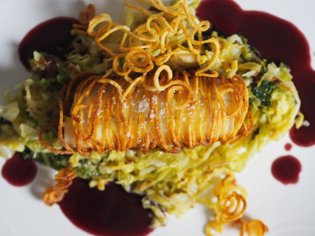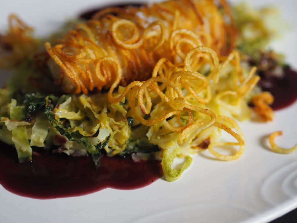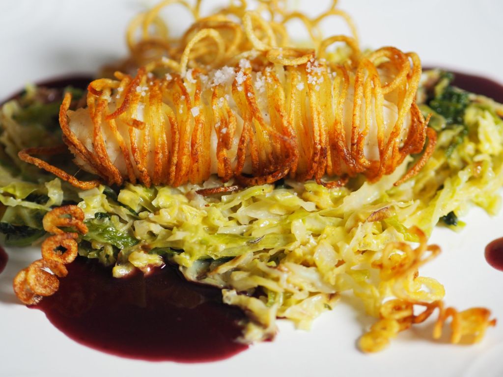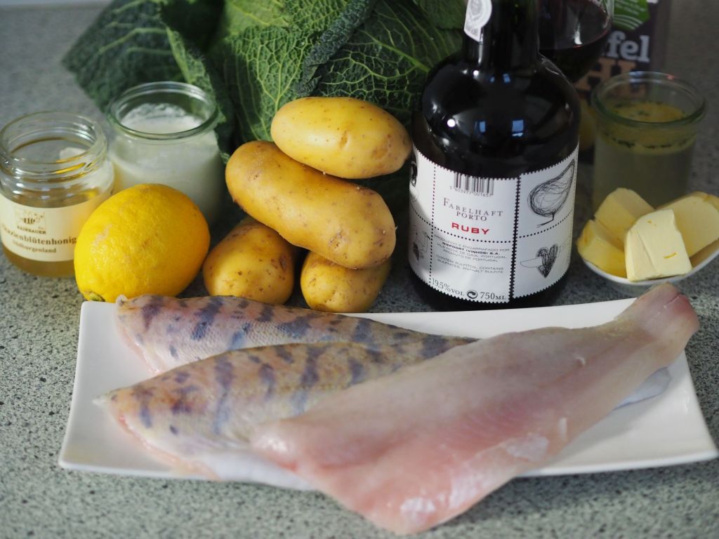 Wir haben Anleihen bei Johann Lafer genommen aus einem Kochbuch, das er mit Eckhart Witzigmann 2020 schrieb. Dabei wird der butterweiche Fisch mit Kelch, also mit Wirsing wie die Norddeutschen zu sagen pflegen, zusammengestellt, und mit Kartoffelgirlanden. Dazu gesellt sich eine Buttersoße mit einem kräftigen Rotwein, also Portwein. Wird schon schief gehen, dachten wir und so haben wir es gemacht.