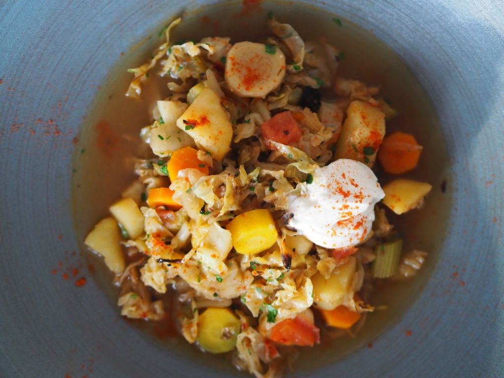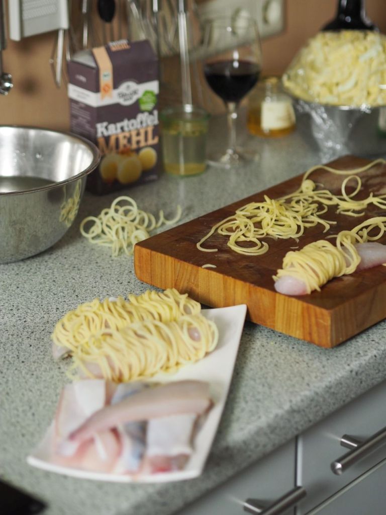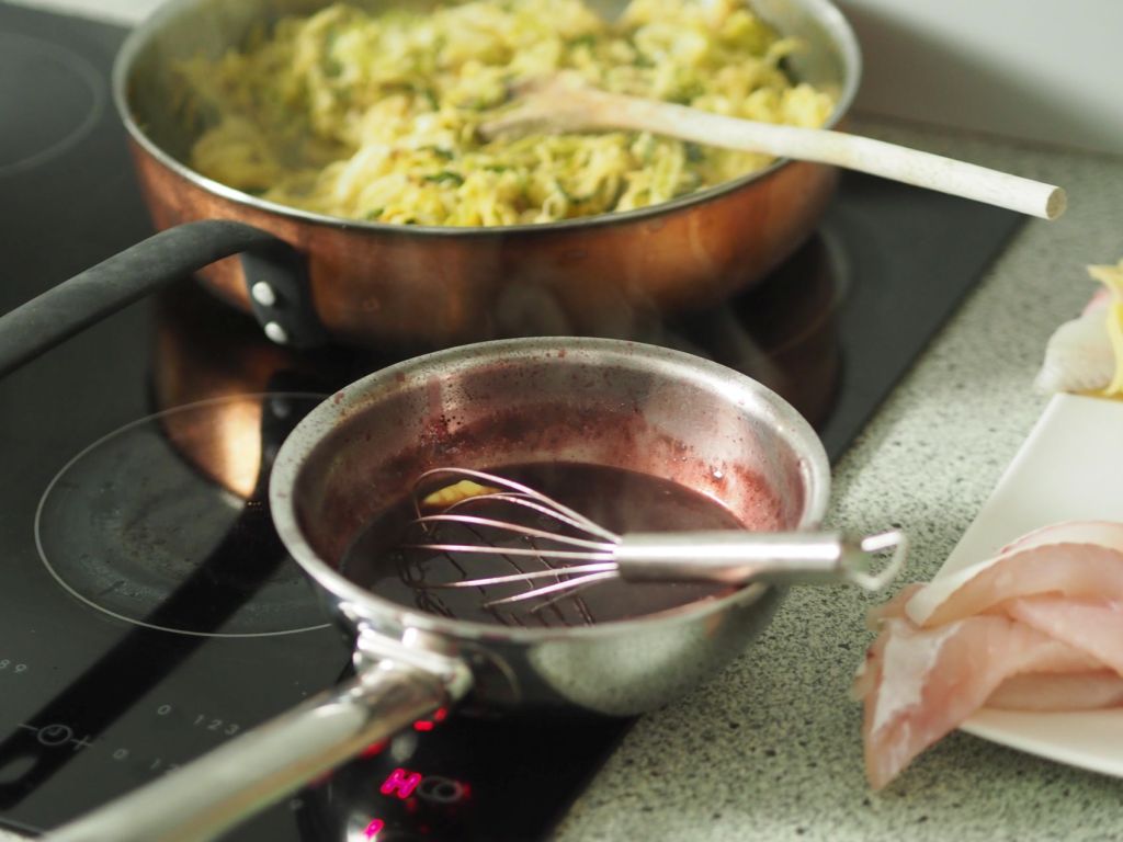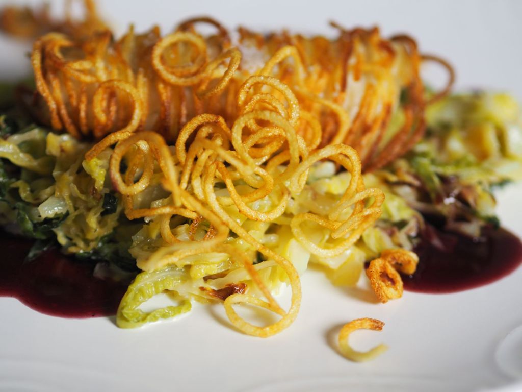 Wir haben Anleihen bei Johann Lafer genommen aus einem Kochbuch, das er mit Eckhart Witzigmann 2020 schrieb. Dabei wird der butterweiche Fisch mit Kelch, also mit Wirsing wie die Norddeutschen zu sagen pflegen, zusammengestellt, und mit Kartoffelgirlanden. Dazu gesellt sich eine Buttersoße mit einem kräftigen Rotwein, also Portwein. Wird schon schief gehen, dachten wir und so haben wir es gemacht.