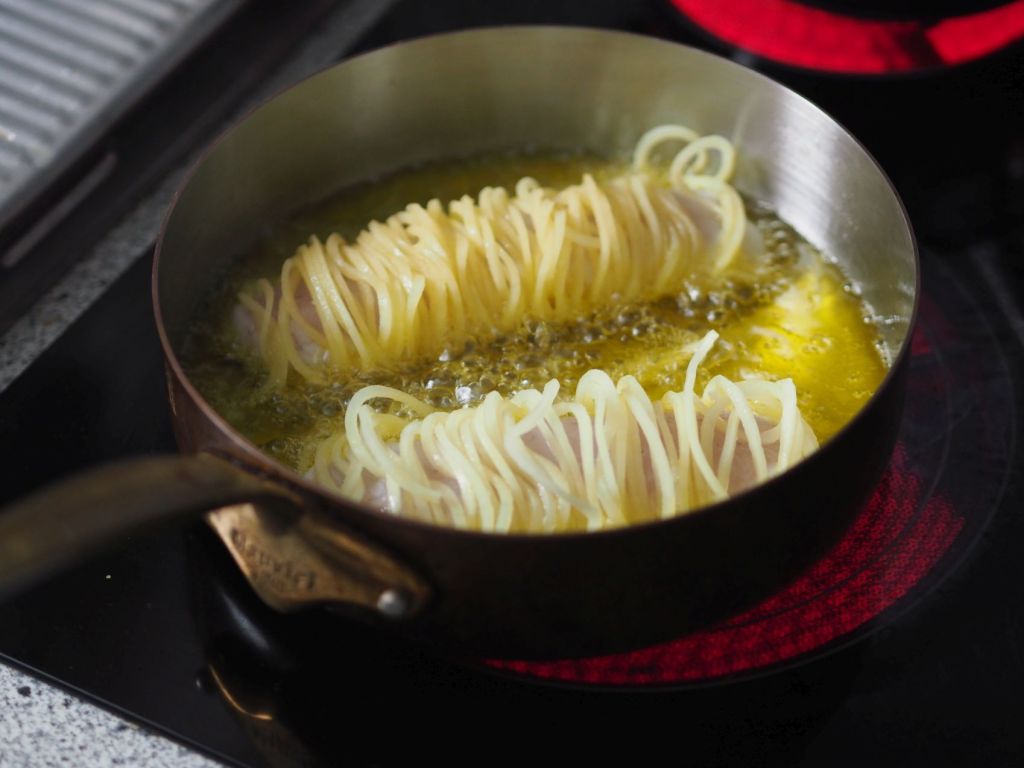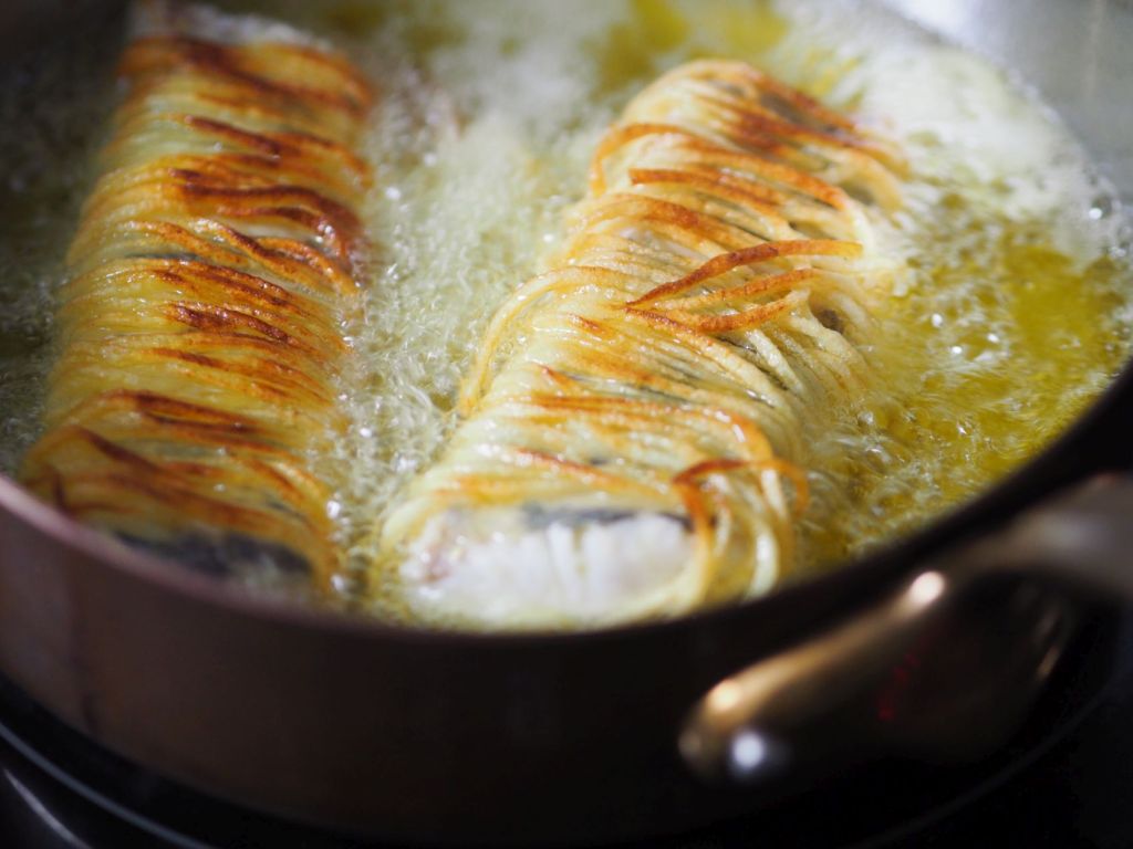 P o r t w e i n s o ß e Zucker in einem Topf karamellisieren lassen. Mit Portwein ablöschen und einköcheln lassen, etwa 15. Min. Salzen, pfeffern. Stärke mit Wasser verrühren und binden. Vom Herd ziehen und Butter Stück für Stück unterrühren, bis eine sämige Melange entsteht. Bei kleiner Flamme warm halten. K e l c h fein schneiden und in einer Sauteuse in Olivenöl anschwitzen. Gemüsefond und Schlagobers beigeben. Zurückdrehen und zudecken, ca. 10 Min. durchgaren. Speisestärke in Wasser verrühren und damit binden. Salzen, pfeffern. F i s c h f i l e t Kartoffeln mit einem Spiralschneider in eine Girlande verwandeln. Skrei salzen, pfeffern, zitronieren, mit den Girlanden ummanteln. In der gußeisernen Pfanne in Olivenöl herausbacken. A n r i c h t e n Kohl auf einen Teller platzieren, den Skrei in der Girlanden darauf legen, mit Portweinsoße ringsum beträufeln.