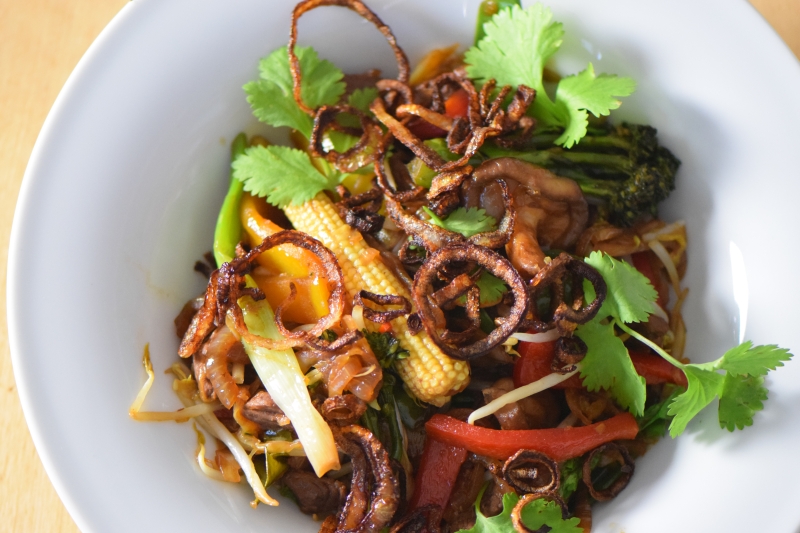 Zuckererbsenschoten, Bimistängel, Mini-Maiskolben, Paprika in verschiedenen Farben, Mungobohnen, Shitakepilze und vieles mehr. Dazu geröstete Schalotten.
