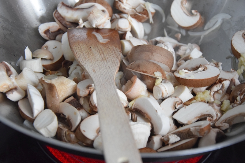 Karfiol-Röschen mit weißen Champignons, braunen Champignons und Kräuterseitlinge im Wok anrösten mit einem scharfen Curry.
