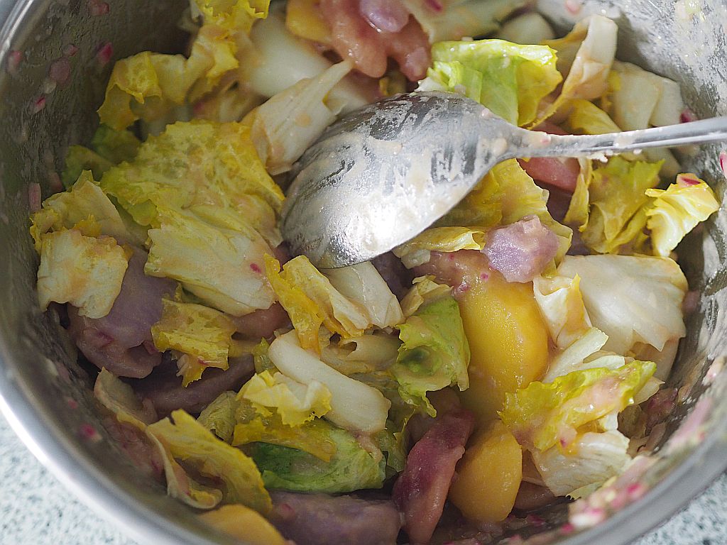 Die Hofköchin hat die Eierspeis für eine Portion gemacht, wir rechnen mit 3 Eiern pro Portion. Was versteht man unter auflockern? Die Hofköchin meint, vorsichtig das schon Gestockte aufheben und das Flüssige darunter fließen lassen, ich hätte es umgerührt. Aber ich glaube die Hofköchin liegt richtig, sonst wäre es ja Rührei geworden.